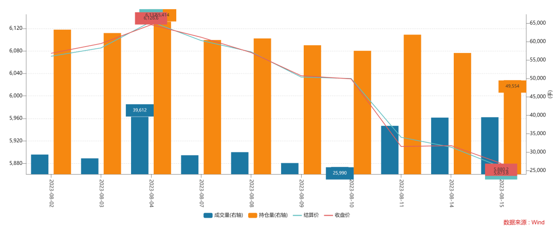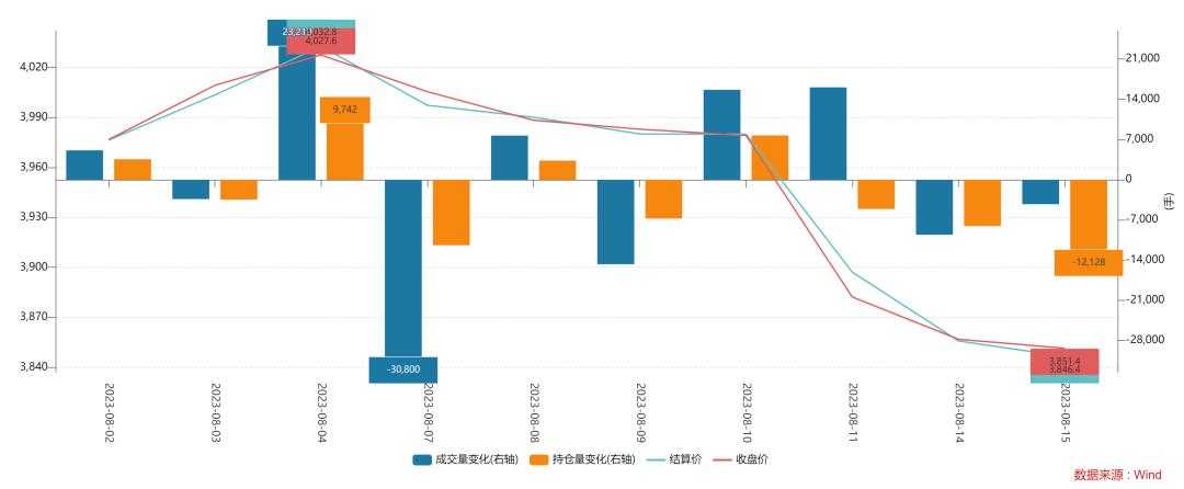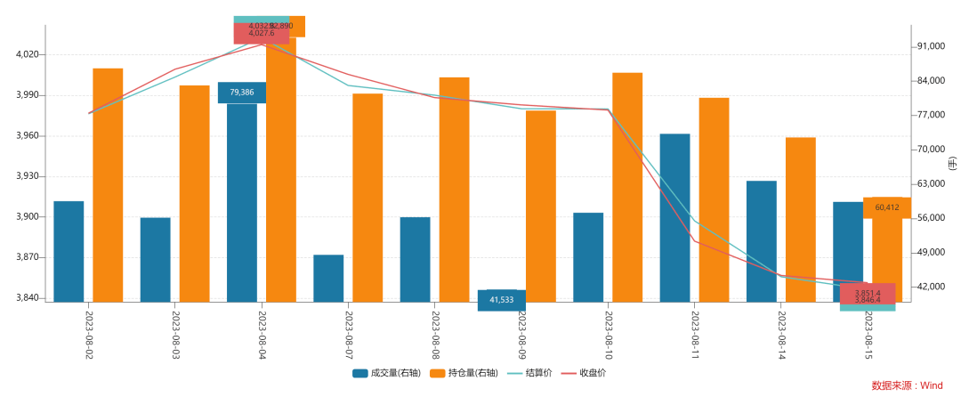 8月15日,IF(沪深300)主连合约收盘价3851.40,较上一交易日下跌4.40,跌幅为0.11%;当日成交量为59400-4278手;当日持仓量为60412-12128手。