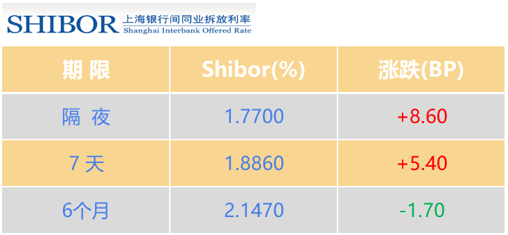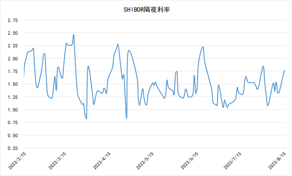 8月15日,上海银行间同业拆放利率(SHIBOR)隔夜利率为1.7700%,较前一交易日上行8.60BP。