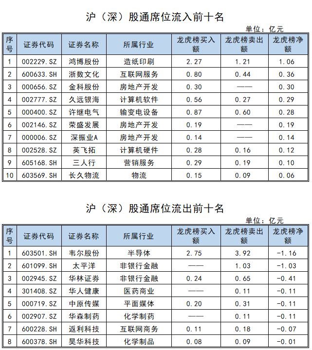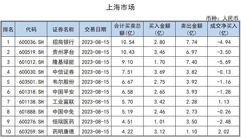 沪股通前十大活跃股中,招商银行居于榜首,买卖总额10.54亿元;贵州茅台、隆基绿能紧随其后,买卖总额分别为10.43亿元、9.10亿元。