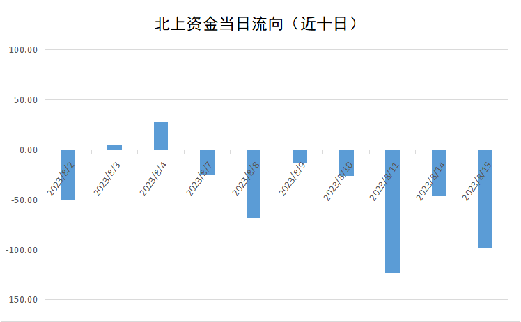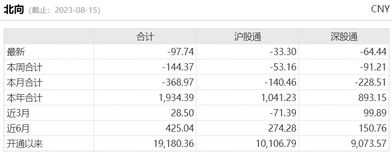 8月15日,北上资金净流出金额为97.74亿元。其中,沪股通当日净流出33.30亿元,深股通当日净流出64.44亿元。