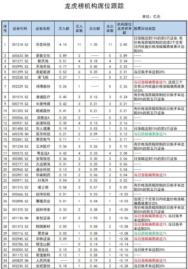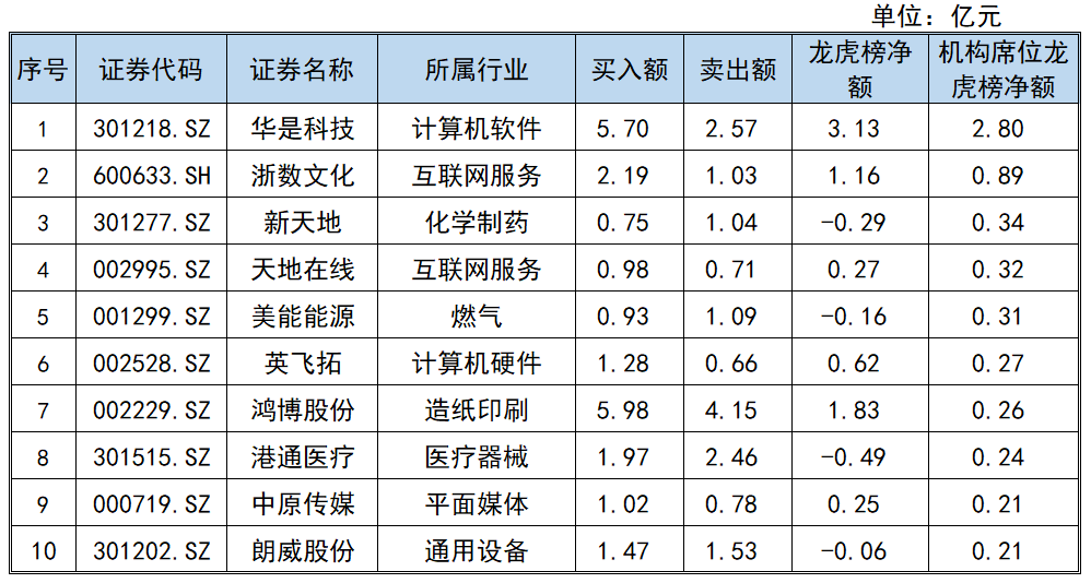 当天机构席位龙虎榜净流入前三的股票分别为:华是科技、浙数文化、新天地,机构席位龙虎榜净额分别为:2.80亿元、0.89亿元、0.34亿元。