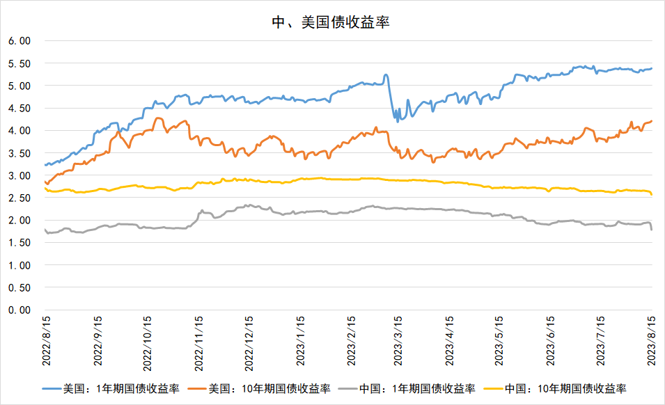 8月15日,1年期美国国债收益率较前一交易日上行1.9BP,报5.389%;10年期美国国债收益率较前一交易日上行2.8BP,报4.218%。