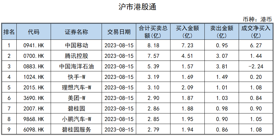 沪市港股通前十大活跃股中,中国移动居于榜首,买卖总额为8.18亿港元;腾讯控股、中国海洋石油紧随其后,买卖总额分别为7.57亿港元、5.39亿港元。