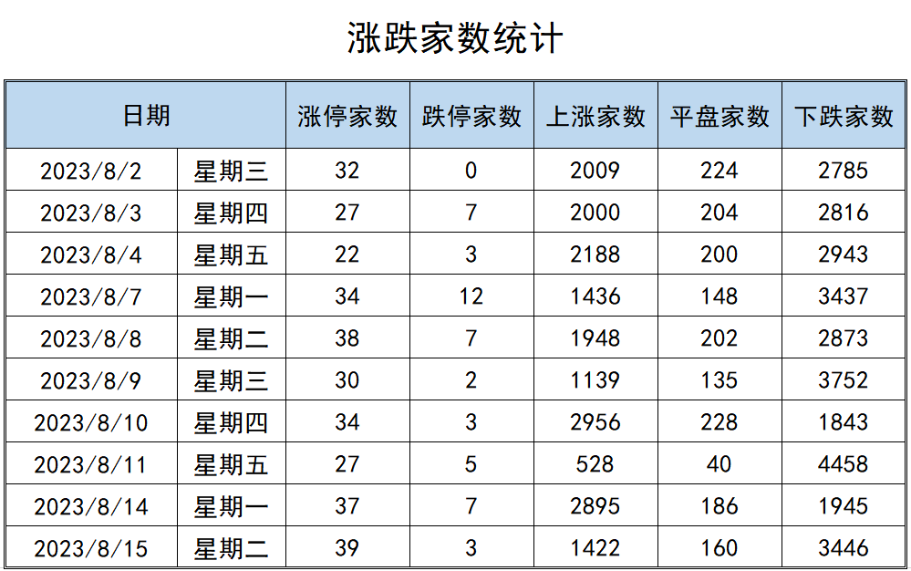 8月15日,个股跌多涨少,沪深两市共1422家上涨,较前一交易日有所减少,其中39家涨停;共3446家下跌,较前一交易日有所增加,其中3家跌停;共160家平盘。