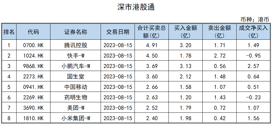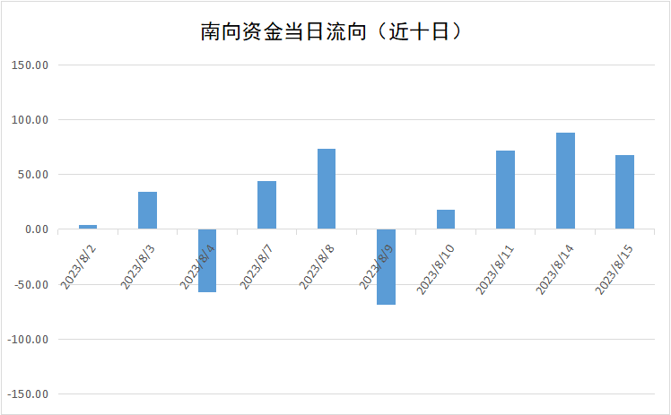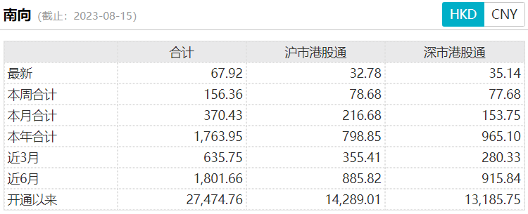 8月15日,南向资金净流入金额达67.92亿港元。其中,沪市港股通当日净流入32.78亿港元,深市港股通当日净流入35.14亿港元。