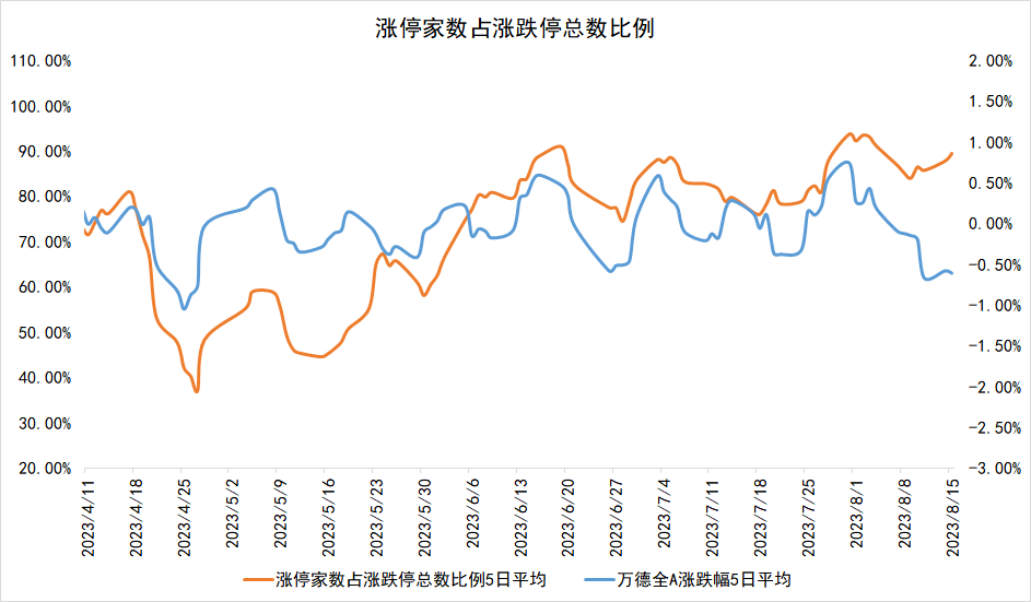 8月15日,沪深两市涨停家数占涨跌停总数比例为92.86%,近5日均值为89.39%,较前一交易日小幅上行。