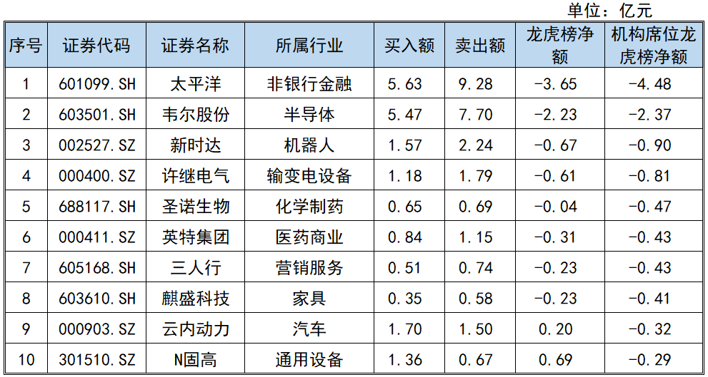 当天机构席位龙虎榜净流出前三的股票分别为:太平洋、韦尔股份、新时达,机构席位龙虎榜净额分别为:-4.48亿元、-2.37亿元、-0.90亿元。