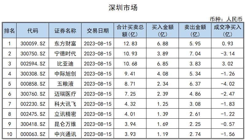 深股通前十大活跃股中,东方财富买卖总额为12.83亿元,居于首位;其次是宁德时代、比亚迪,买卖总额分别为10.93亿元、10.68亿元。
