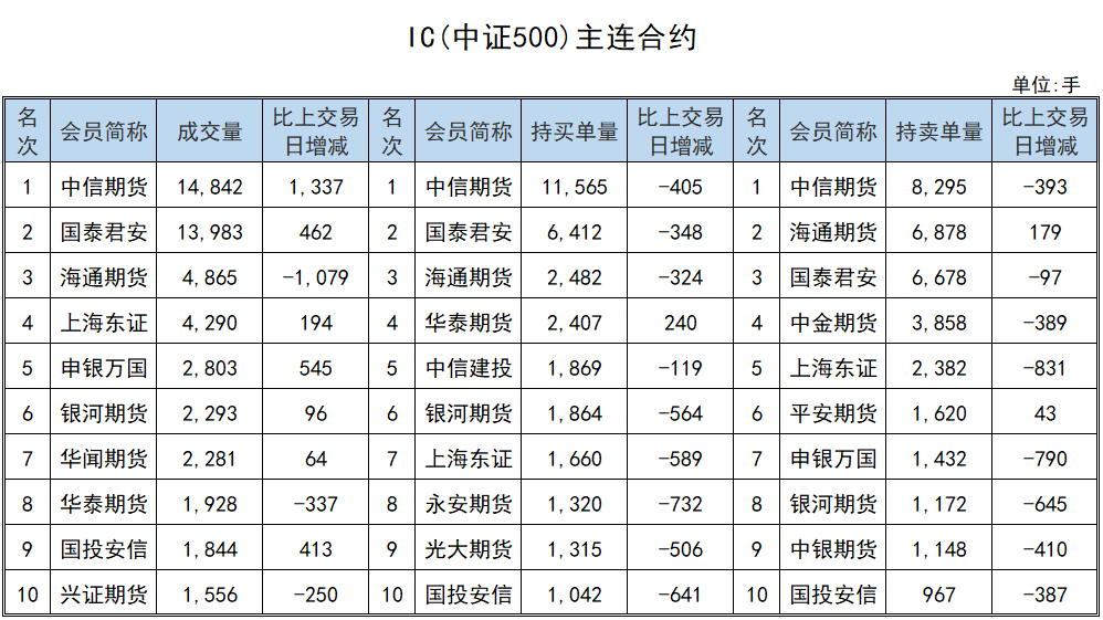 成交量居首位的是中信期货,成交量为14842+1337手,目前持有买单量11565-405手,持有卖单量8295-393手。
