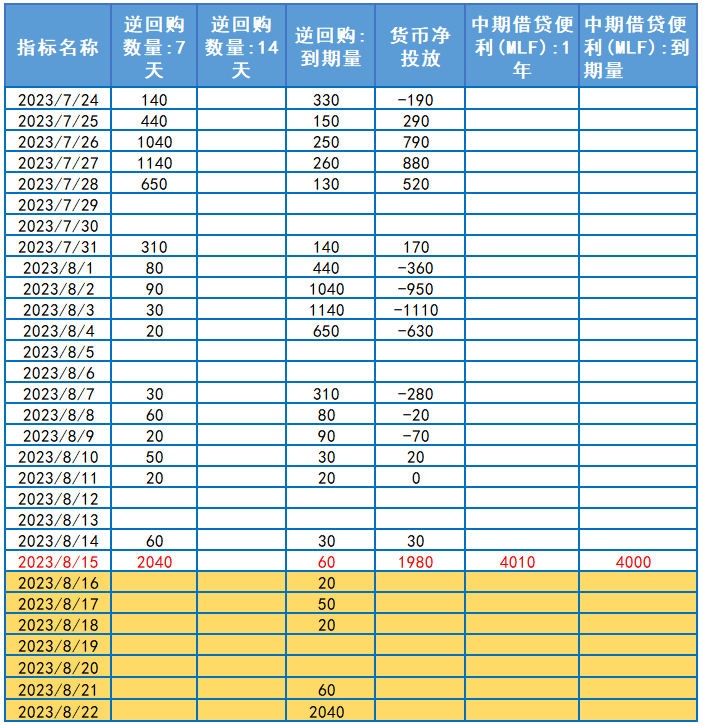 为对冲税期高峰等因素的影响,维护银行体系流动性合理充裕,2023年8月15日,人民银行以利率招标方式开展了2040亿元7天逆回购操作,中标利率为1.80%,此前为1.90%,较上期下调10个基点。同日,人民银行开展了4010亿元一年期中期借贷便利(MLF)操作,中标利率为2.50%,此前为2.65%,较上期下调15个基点。因今日有60亿元逆回购及4000亿元中期借贷便利到期,当日净投放资金1990亿元。