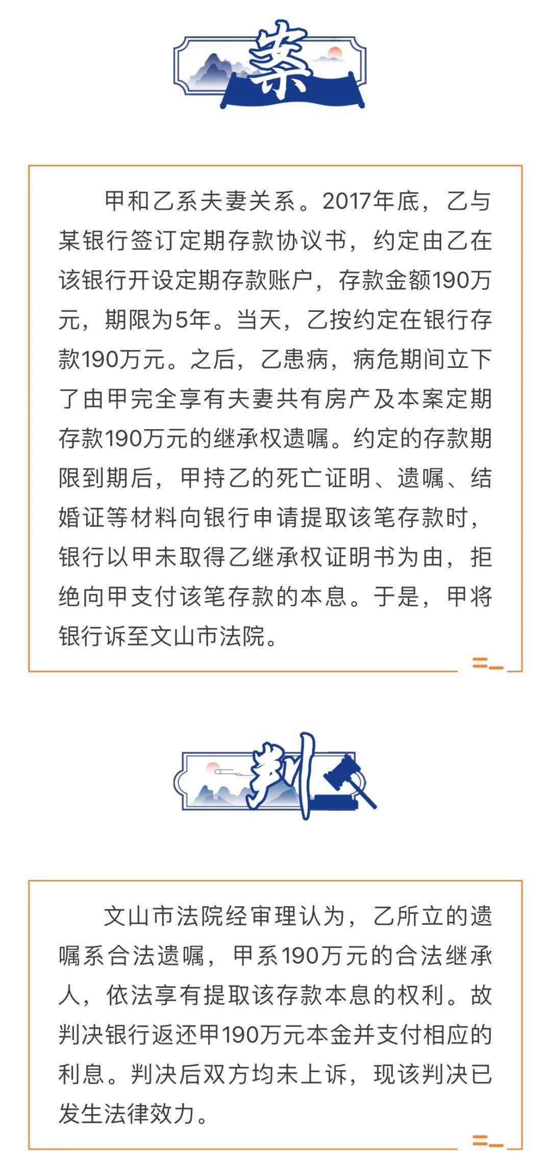 随后,家人将银行告到法院。法院认为,家人所提交的遗嘱是合法遗嘱,依法享有提取该存款本息的权利。最后判决银行返还190万元本金并支付相应的利息。