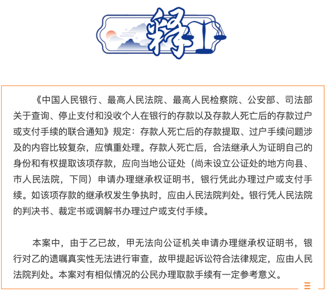 云南省高级人民法院也表示,本案对有相似情况的公民办理取款手续有一定参考意义。