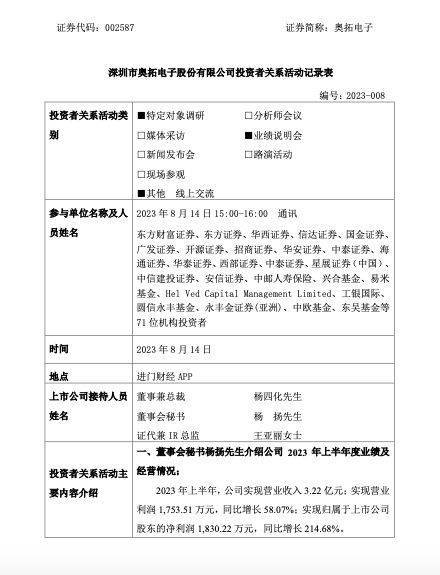 奥拓电子向投资者介绍了公司2023年上半年度业绩及经营情况。2023年上半年,公司实现营业收入3.22亿元;实现营业利润1,753.51万元,同比增长58.07%;实现归属于上市公司股东的净利润1,830.22万元,同比增长214.68%。