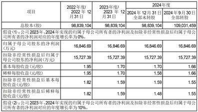 2、本次向不特定对象发行可转换公司债券期限为6年,转股期限自发行结束之日起满6个月后的第一个交易日起至可转换公司债券到期日止,则分别假设所有可转换公司债券持有人截至2024年9月30日全部转股(即转股率为100%且转股时一次性全部转股)或截至2024年12月31日全部未转股(即转股率为0%)两种情形。该转股完成时间仅用于计算本次发行对即期回报的影响,最终以可转换公司债券持有人实际完成转股的时间为准。公司不对实际完成时间构成承诺,投资者不应据此进行投资决策,投资者据此进行投资决策造成损失的,公司不承担赔偿责任。
