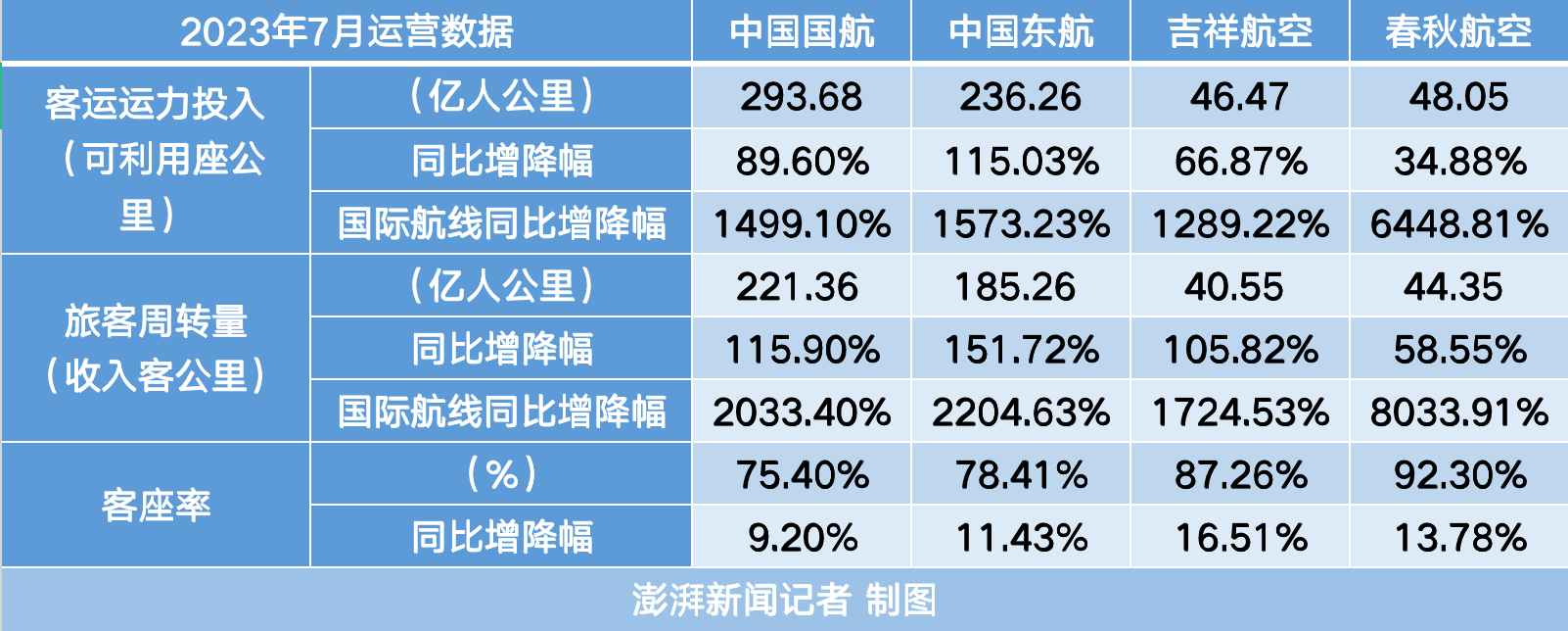 多家航司7月运营数据。澎湃新闻记者统计