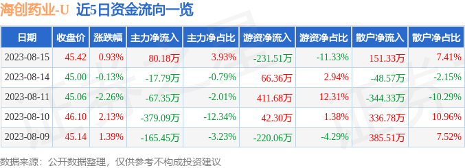 8月15日的资金流向数据方面,主力资金净流入80.18万元,占总成交额3.93%,游资资金净流出231.51万元,占总成交额11.33%,散户资金净流入151.33万元,占总成交额7.41%。