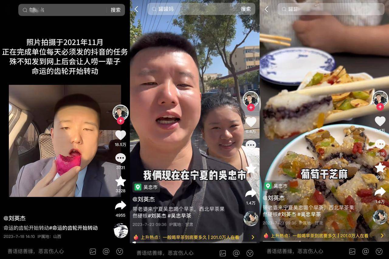 作为一名置业顾问,@刘英杰 因“单位要求每天发抖音”而突发奇想,在车内做吃播。凭借着真实有趣的内容,他于机缘巧合之下在抖音走红,如今已拥有300万+粉丝。走红后的刘英杰不再做单一的车内吃播,而是带着父亲和妻子走遍祖国大好河山,品尝各地特色美食,传递朴实的人生态度。