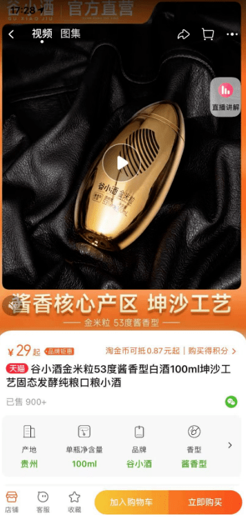 记者在线上天猫店了解到,100毫升12瓶装的53度酱香型谷小酒金米粒白酒的价格为288元,而单瓶的售价为29元一瓶。
