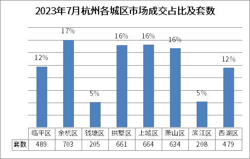 余杭区成交量居前,占比约17%;其次是上城区,成交量占比约16%。
