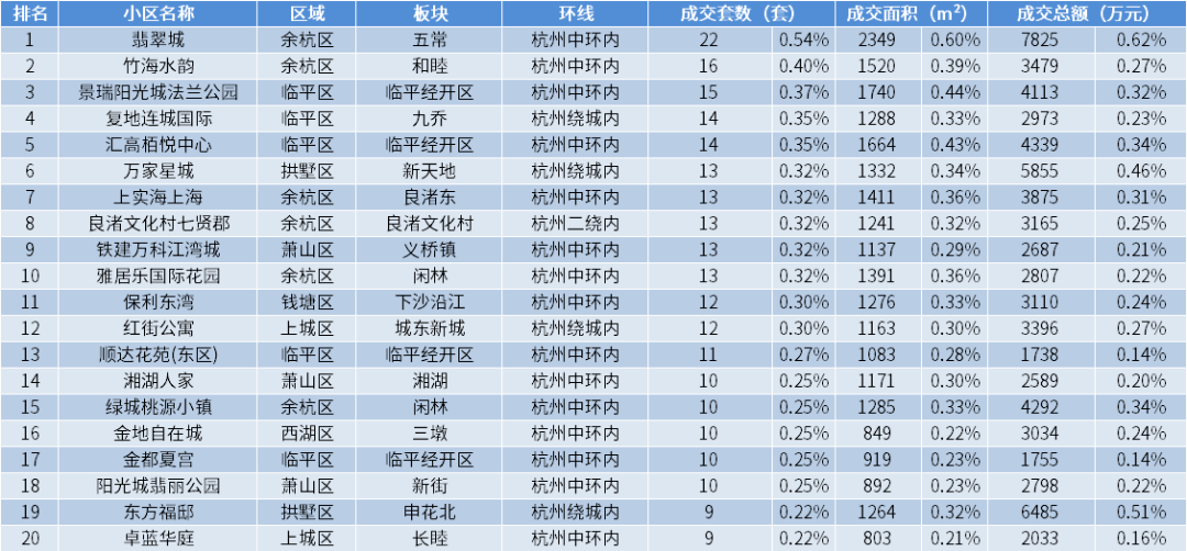 7月杭州二手住宅成交TOP20小区合计成交房源249套,总成交面积为25778㎡,总成交额约为7.23亿元,成交均价为28066元/㎡。