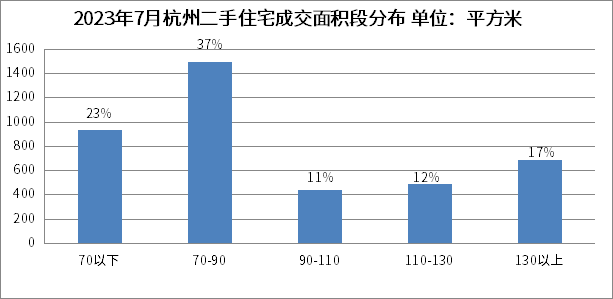 从成交面积段分布来看,7月杭州二手住宅成交主要集中在70-90m²的房源,合计成交1497套,占比约37%;70㎡以下的房源成交量次之,共932套,占比23%。90-110㎡的成交房源占比垫底,约为11%。