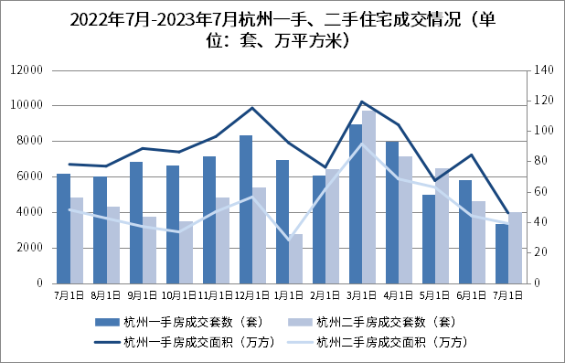 7月,杭州二手住宅市场(除临安、富阳)成交4043套房源,环比下跌13.3%;成交面积39万方,环比下跌11.5%。同期新房成交套数为3353套,环比下跌42.4%;成交面积约为46万方,环比下跌45.2%。