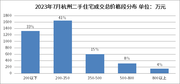 从成交总价段来看,7月杭州二手住宅成交主要集中于200-350万的总价段房源,合计成交1649套,占比41%,套均价约为265万元。
