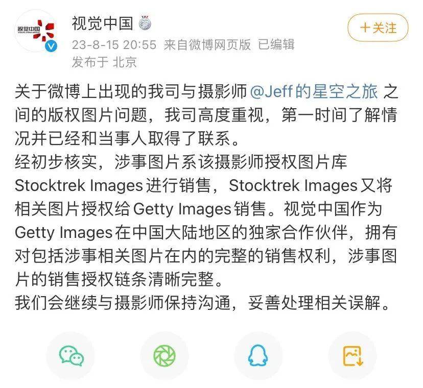 8月15日晚,视觉中国回应称:会继续与摄影师保持沟通,妥善处理相关误解。