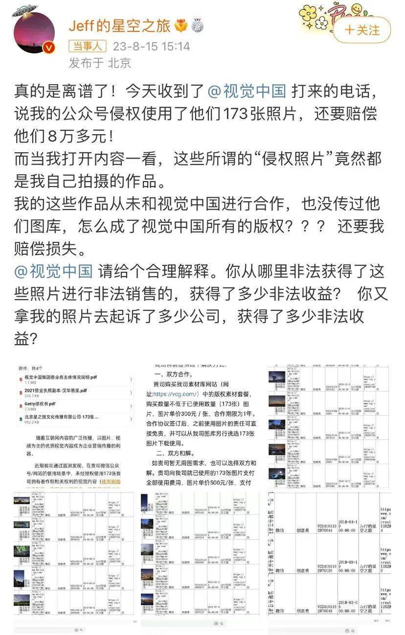 据环球时报,8月15日下午,科学科普博主、星空摄影师戴建峰在网络上发文称,他接到“视觉中国”的电话,对方称自己拍摄的作品对“视觉中国”的173张照片造成侵权,需要赔偿8万元。