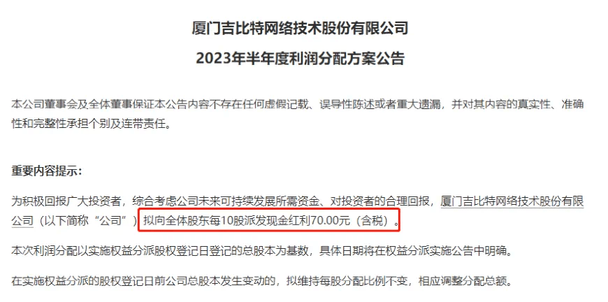 8月15日傍晚,A股公司吉比特表示,吉比特拟向全体股东每10股派发现金红利70.00元(含税)。目前来看,这应该是最壕中期分红方案。
