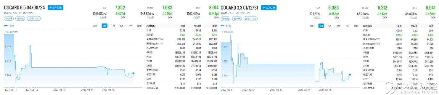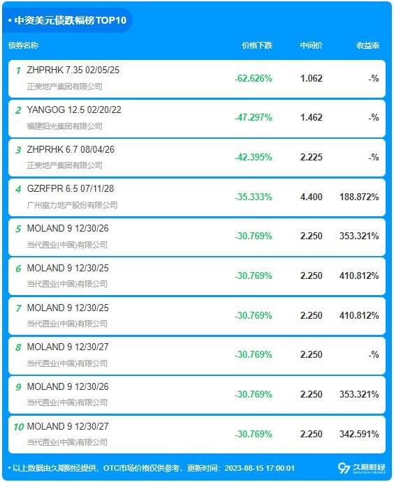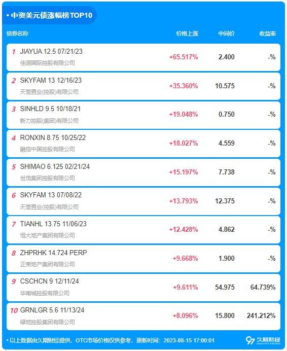 8月15日,中资美元债涨跌幅榜TOP10如下: