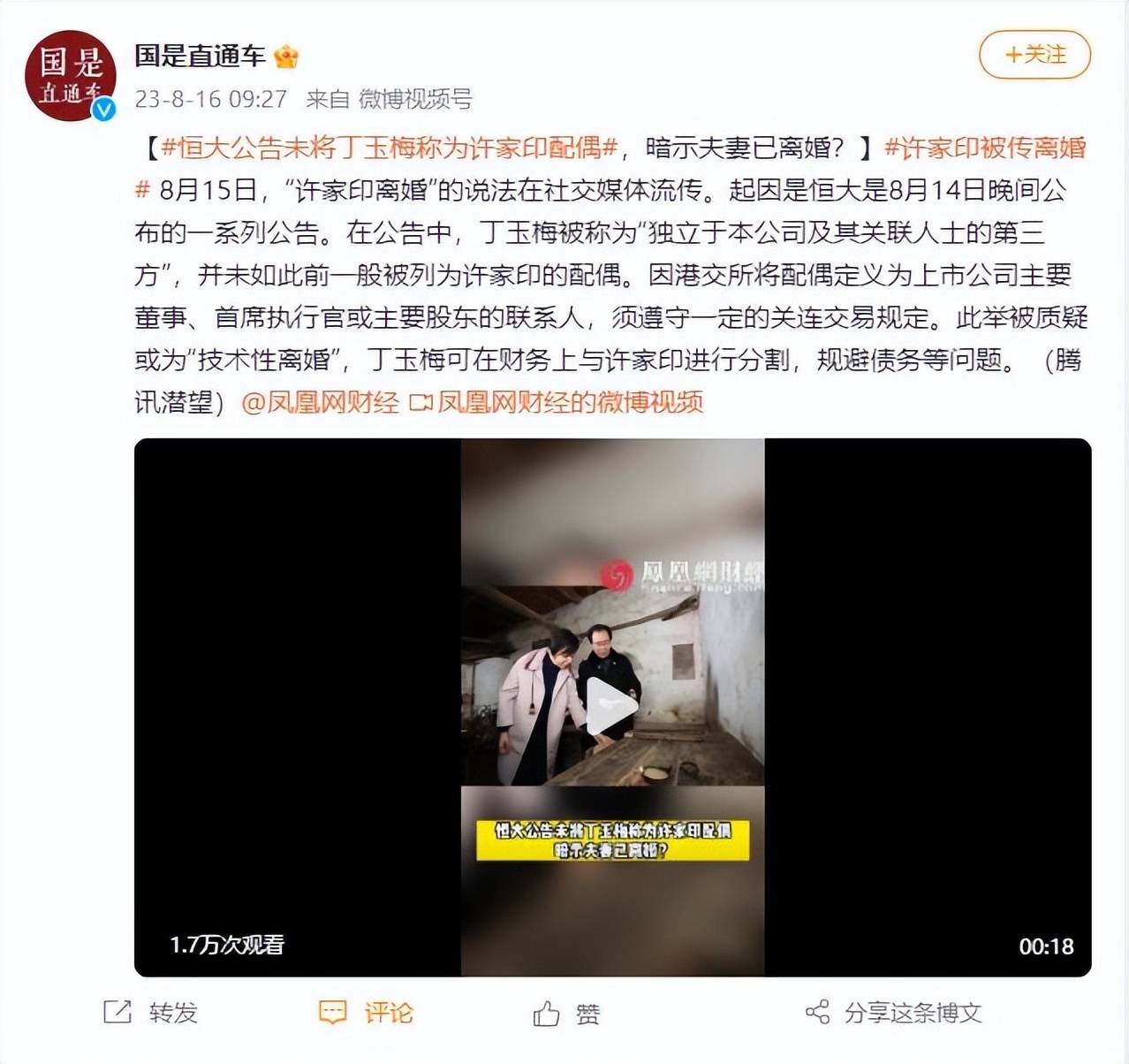 8月16日,据中新社“国是直通车”援引凤凰财经视频报道:8月15日,“许家印离婚”的说法在社交媒体流传。起因是恒大是8月14日晚间公布的一系列公告。
