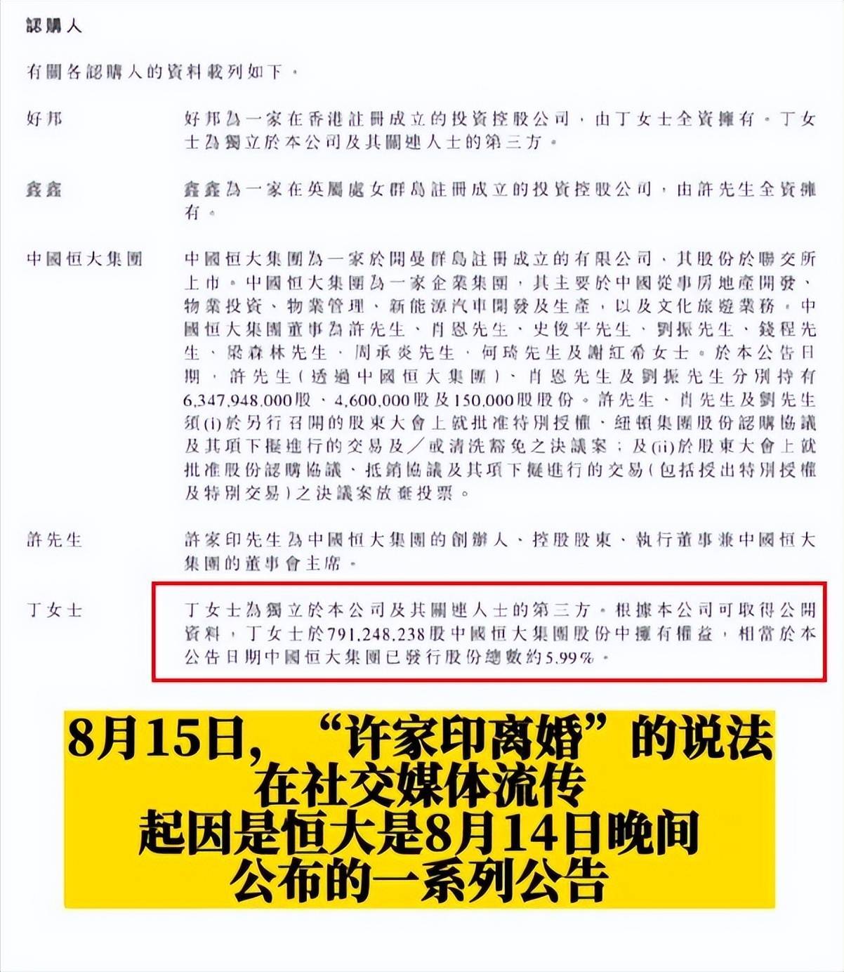 原标题:恒大公告未将丁玉梅称为许家印配偶,暗示夫妻已离婚?
