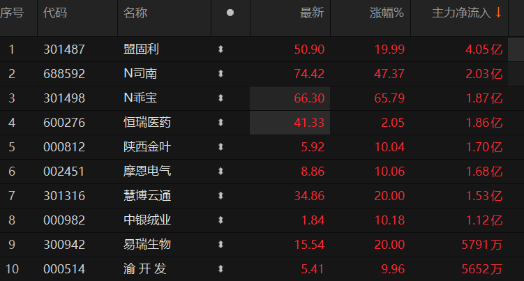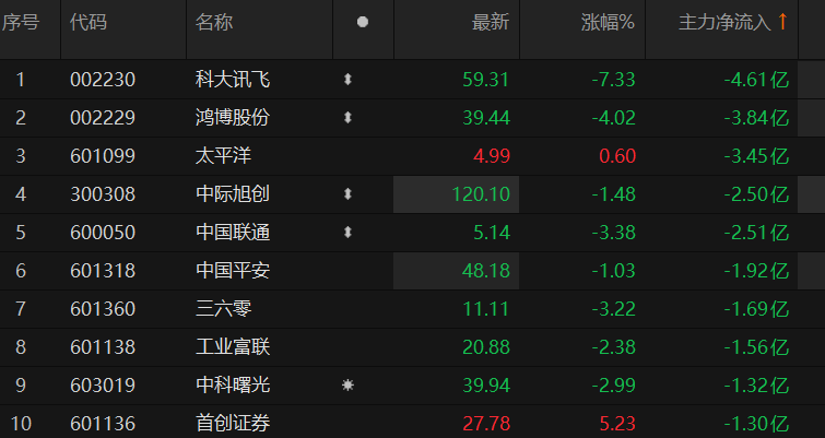 个股方面,盟固利主力资金净流入超4亿元;科大讯飞主力资金净流出超4亿元。
