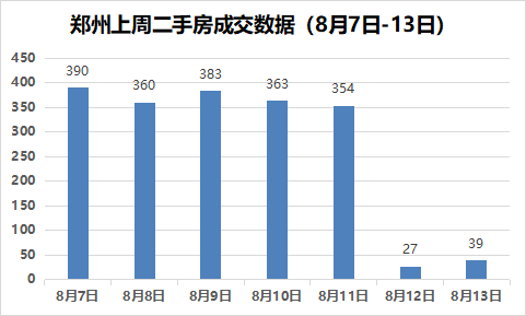 上周二手房共成交1916套,较上上周1882套多成交34套。其中单日成交最高的为8月7日,成交390套,当日成交前三的区域分别为金水区83套、中原区51套、二七区43套。