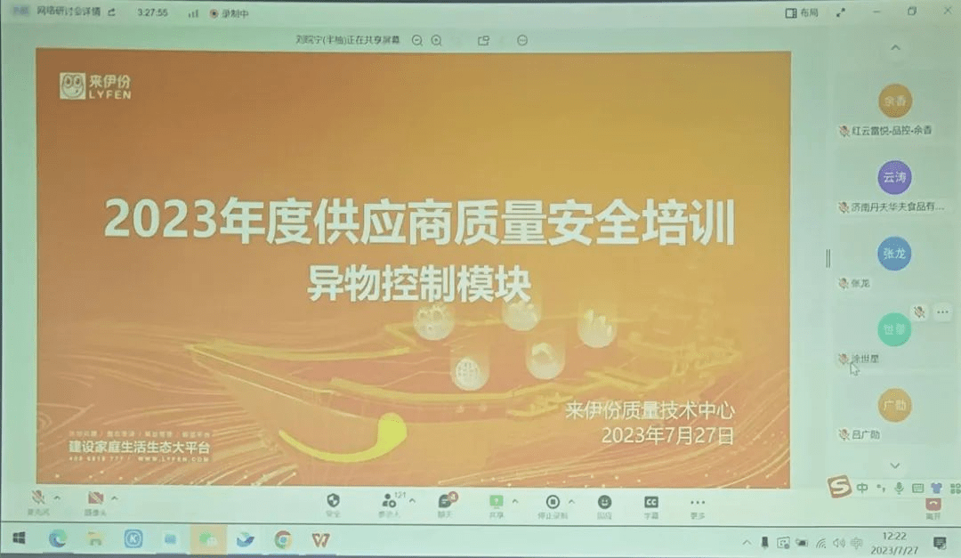 近日,来伊份2023年度供应商质量安全培训大会异物管控专场培训在线上召开,近200名来伊份供应商代表参加本次线上大会,作为国内食品工作服行业领军企业 成都创始织造有限公司 受邀参加本次会议,本次会议食品工作服专场内容由成都创始公司产品技术总监 徐明 讲解异物控制与食品工作服管理。同时受邀的还有SGS异物控制专家陈为忠老师。