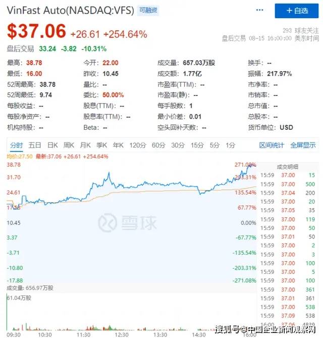 8月15日周二,越南电动汽车生产商VinFast完成与一家特殊目的收购公司(SPAC)Black Spade Acquisition的合并,周二已开始在纳斯达克交易。其股价一路高歌,盘中最高触及38.78美元,报收37.06美元,涨幅达254.64%,意味着越南首富范日旺的身家增加390亿美元。