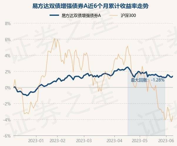 6月8日,易方达双债增强债券A最新单位净值为1.7元,累计净值为2.21元,较前一交易日上涨0.12%。历史数据显示该基金近1个月下跌0.47%,近3个月下跌0.18%,近6个月上涨1.37%,近1年上涨1.98%。该基金近6个月的累计收益率走势如下图: