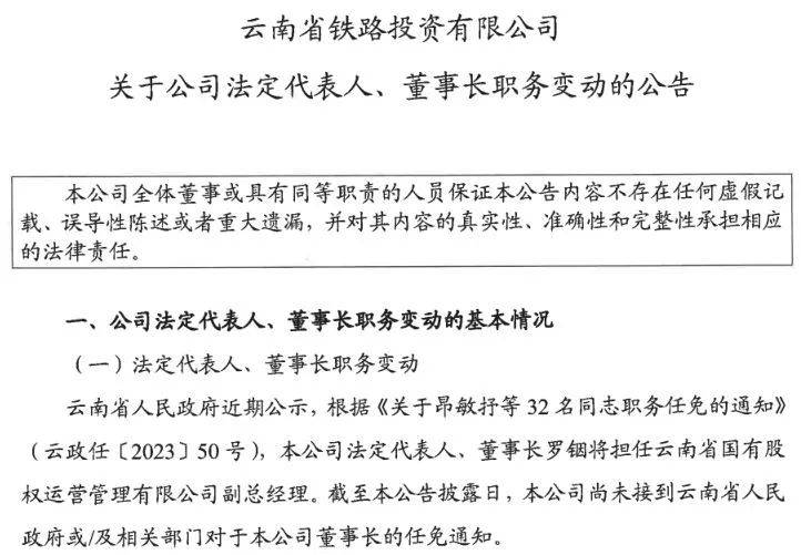 《公告》显示,根据云南省政府近期公示,云南铁路投资公司法定代表人、董事长罗铟将担任云南省国有股权运营管理公司副总经理。目前,云南铁路投资公司尚未接到云南省政府或相关部门对于云南铁路投资公司董事长的任免通知。