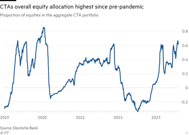 据德意志银行(Deutsche Bank)称,最近几周,大宗商品交易顾问(CTA),即依靠模式检测算法和统计模型指导跨市场交易的对冲基金增加了对股票的风险敞口,并达到了自新冠疫情爆发前以来的最高水平。