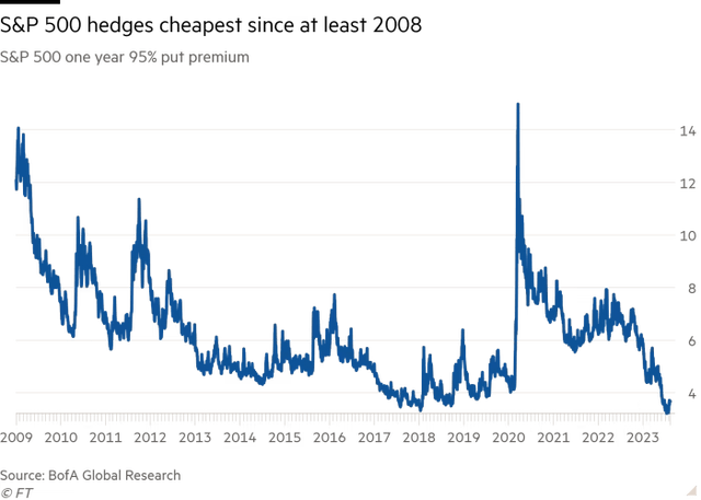 市场也尚未考虑到这些风险。美国银行分析师在7月底表示:“自我们的数据始于2008年开始记录以来,防范标普500指数在未来12个月下跌的成本从未如此之低。”