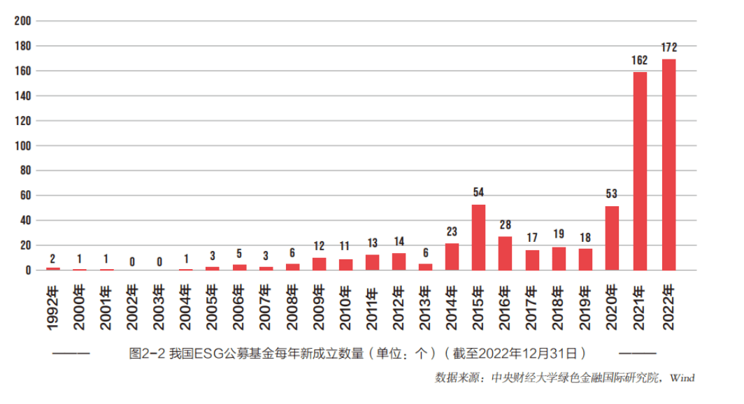 从数量上看,2001年至2010年ESG公募基金成立数量较少;2011年至2015年呈缓慢增长的态势;2016年至2020年新增数量略有波动。随着双碳目标的提出、生态文明建设的推动以及ESG理念的深入发展,2021年ESG公募基金成立数量呈现井喷式增长。据统计,2021年新成立的ESG公募基金达162只,同比增长205.6%,增速创历史新高;2022年新增ESG公募基金达172只,同比增长6.17%,表明资管机构仍持续不断提高对ESG产品的重视程度。