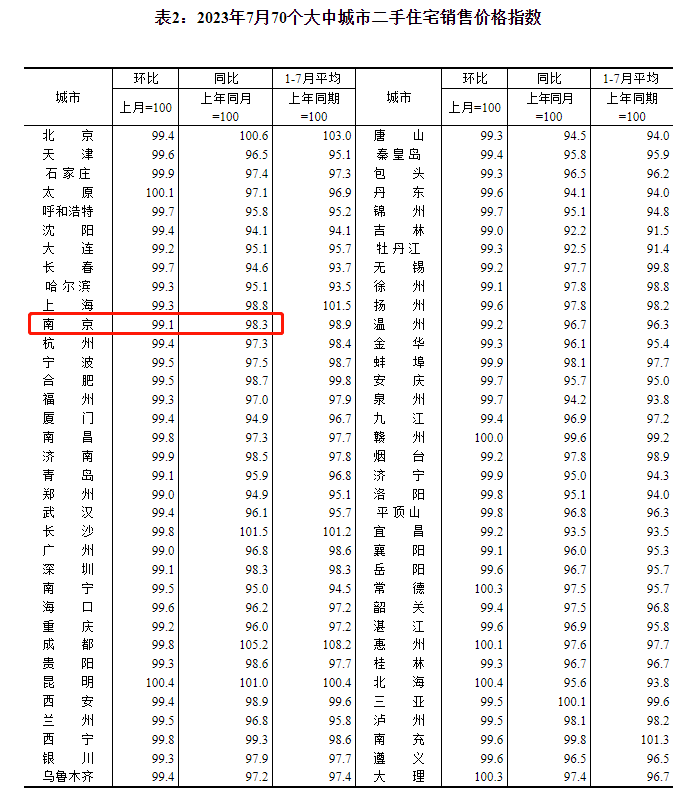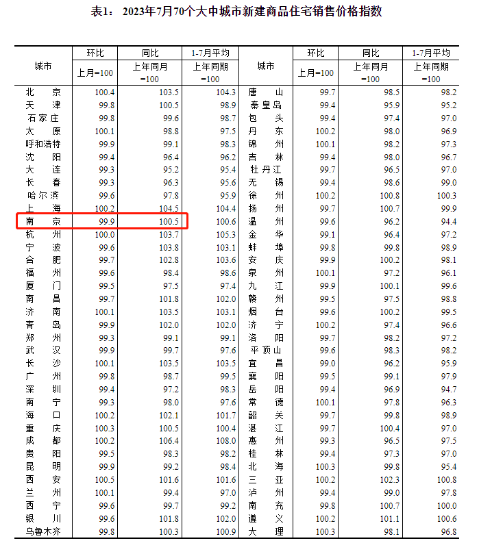今日,国家统计局发布《2023年7月份70个大中城市商品住宅销售价格变动情况》,其中,7月南京新房环比下降0.1%,同比上涨0.5%;二手房价格环比下降0.9%,同比下降1.7%。