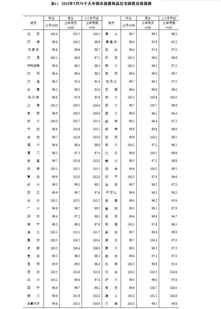 表1:2023年7月70个大中城市新建商品住宅销售价格指数
