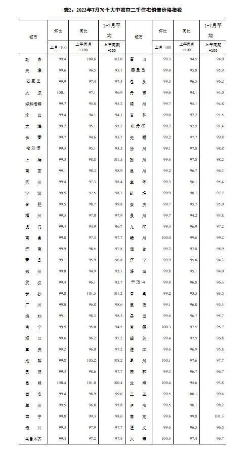 表2:2023年7月70个大中城市二手住宅销售价格指数