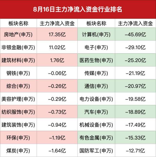 资金流向上,主力净买入前三的是房地产、非银金融、建筑材料行业板块,分别获得主力资金净买入17.35亿元、11.02亿元、1.76亿元。遭主力净卖出前三的是计算机、电子、医药生物行业板块,主力分别净卖出45.69亿元、29.1亿元、25.2亿元。