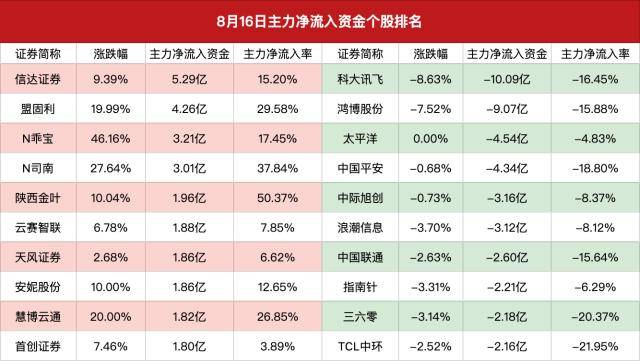 信达证券、盟固利、N乖宝分别获主力净买入5.29亿元、4.26亿元、3.21亿元。科大讯飞、鸿博股份、太平洋分别遭主力净卖出10.09亿元,9.07亿元,4.54亿元。