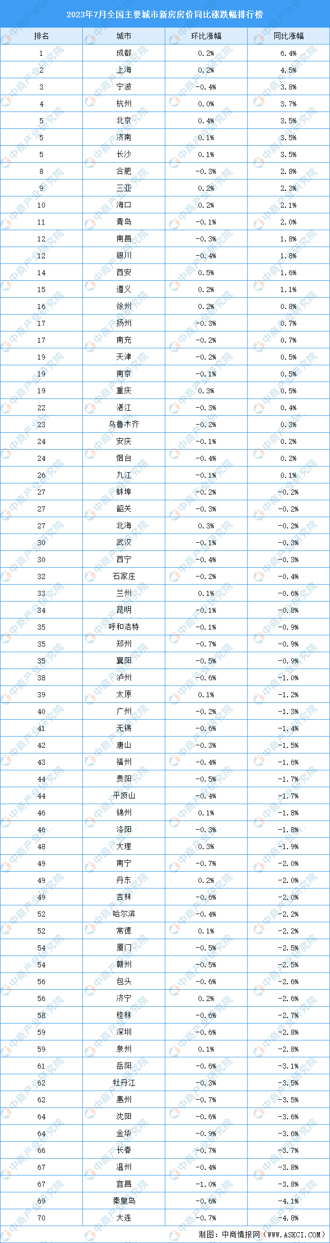 具体城市来看,成都领涨全国,新房房价同比上涨6.4%,涨幅较上月收窄0.8个百分点。上海、宁波排名第二和第三,新房房价同比分别上涨4.5%、3.8%,涨幅较上月均收窄0.3个百分点。