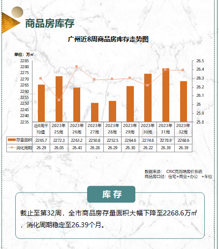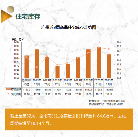 截止至第32周,全市商品住宅存量面积下降至1184.6万㎡,去化周期缩短至18.14个月。