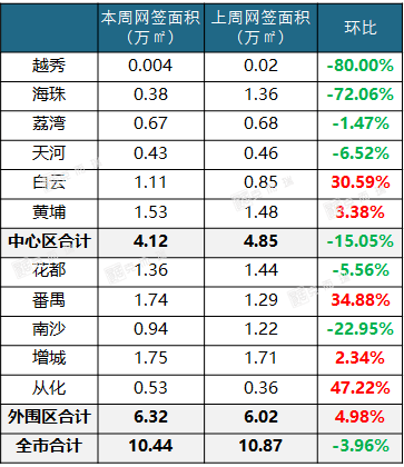 从环比来看,大部分区域录得下降,尤其是市区越秀、海珠集中网签大幅减少,环比录得逾七成跌幅。